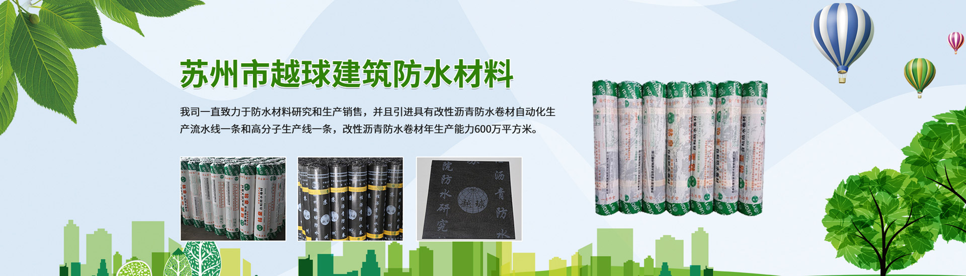 蘇州市越球建筑防水材料有限公司地處蘇州市吳江七都開發(fā)區(qū),近鄰上海郊區(qū),靠近浙江南潯邊上,景色秀麗,氣候宜人,物產(chǎn)豐富,是富饒美麗的江南好地方。本企業(yè)擁有中高級(jí)科研人員多名,技術(shù)力量雄厚,檢測設(shè)備齊全,是研究開發(fā),生產(chǎn)經(jīng)營和施工管理為一體的現(xiàn)代化高科技專業(yè)生產(chǎn)防水材料的企業(yè)。